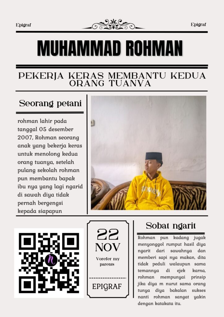 Setiap pagi sebelum matahari muncul, Rohman, seorang anak petani yang tinggal di sebuah desa kecil di pinggir sawah, selalu bangun lebih awal dari teman-teman seusianya. Siapa dia? Rohman adalah seorang siswa SMP yang terkenal rajin dan tidak gengsi melakukan pekerjaan berat.Apa yang ia lakukan? Ia membantu kedua orang tuanya ngarit, mencari rumput untuk memberi makan sapi-sapi milik keluarganya.