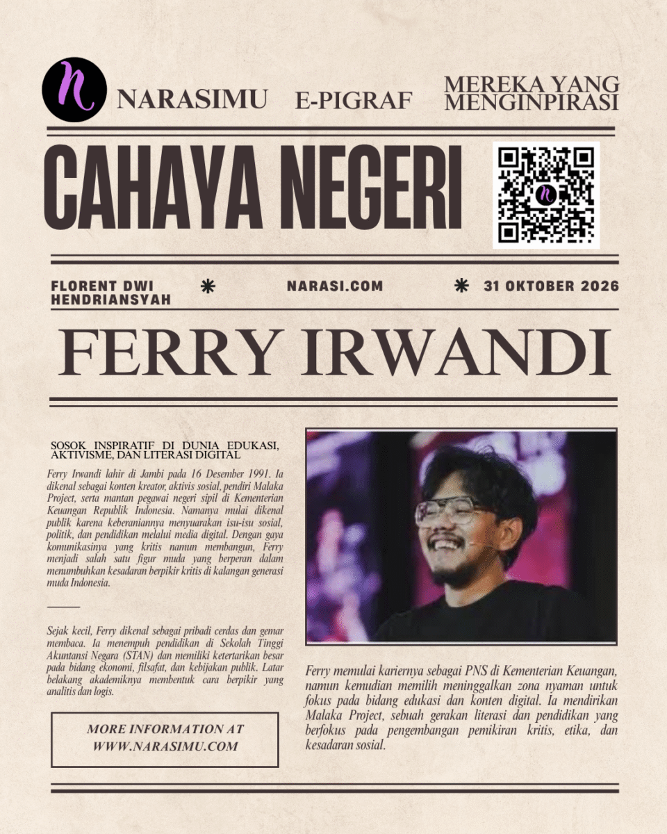 Ferry Irwandi lahir di Jambi pada 16 Desember 1991. Ia dikenal sebagai konten kreator, aktivis sosial, pendiri Malaka Project, serta mantan pegawai negeri sipil (PNS) di Kementerian Keuangan Republik Indonesia. Sosoknya mencuri perhatian publik karena keberaniannya menyuarakan isu-isu sosial, politik, dan pendidikan melalui media digital. Dengan gaya komunikasinya yang kritis namun membangun, Ferry menjadi salah satu figur muda yang berperan penting dalam mendorong kesadaran berpikir kritis di kalangan generasi muda Indonesia.