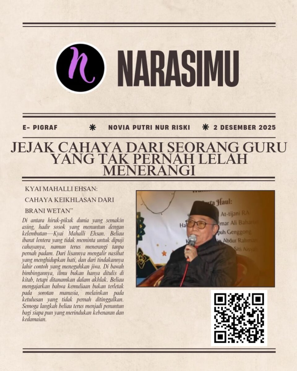 Di antara hiruk-pikuk dunia yang semakin asing, hadir sosok yang menuntun dengan kelembutan—Kyai Mahalli Ehsan. Beliau ibarat lentera yang tidak meminta untuk dipuji cahayanya, namun terus menerangi tanpa pernah padam. Dari lisannya mengalir nasihat yang menghidupkan hati, dan dari tindakannya lahir contoh yang meneguhkan jiwa. Di bawah bimbingannya, ilmu bukan hanya ditulis di kitab, tetapi ditanamkan dalam akhlak. Beliau mengajarkan bahwa kemuliaan bukan terletak pada sorotan manusia, melainkan pada ketulusan yang tidak pernah ditinggalkan. Semoga langkah beliau terus menjadi penuntun bagi siapa pun yang merindukan kebenaran dan kedamaian.
