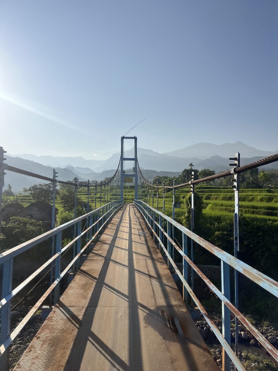 Namun, di balik keindahan itu tersimpan kisah perjuangan. Beberapa kali banjir besar menerjang sungai di bawahnya, menghancurkan jembatan lama hingga tersisa hanya tiang penyangga. Tapi warga tak menyerah. Dengan gotong royong, mereka bangun kembali — dari kayu seadanya hingga akhirnya berdirilah jembatan biru yang kini menjadi kebanggaan desa.
