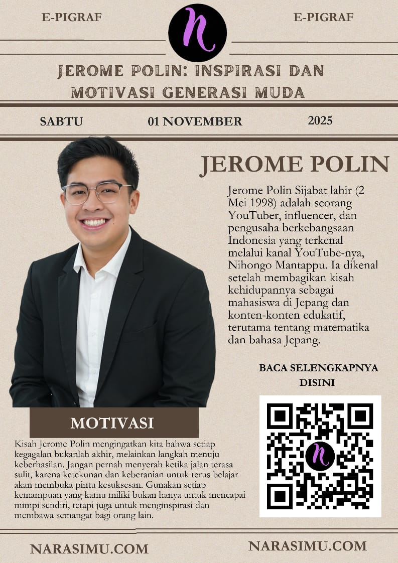Jerome Polin bukan hanya contoh sukses akademis dan bisnis, tetapi juga figur yang menginspirasi banyak generasi muda untuk berani bermimpi dan berusaha tanpa batas. Kisahnya menjadi cerminan pentingnya pantang menyerah, belajar dari kegagalan, dan memanfaatkan kemampuan untuk memberi inspirasi kepada orang lain. Melalui media sosial dan bisnis, ia membuktikan bahwa kolaborasi, edukasi, dan inovasi bisa berjalan beriringan dalam meraih kesuksesan.
