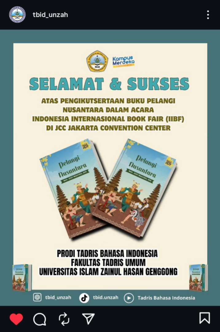 Prestasi membanggakan datang dari mahasiswa angkatan 24 Program Studi Tadris Bahasa Indonesia, Fakultas Tadris Umum, Universitas Islam Zainul Hasan Genggong (UNZAH). Buku kolaborasi mereka, “Pelangi Nusantara”, berhasil terpilih untuk ikut serta dalam Indonesia International Book Fair 2025 di Jakarta Convention Center (JCC).
