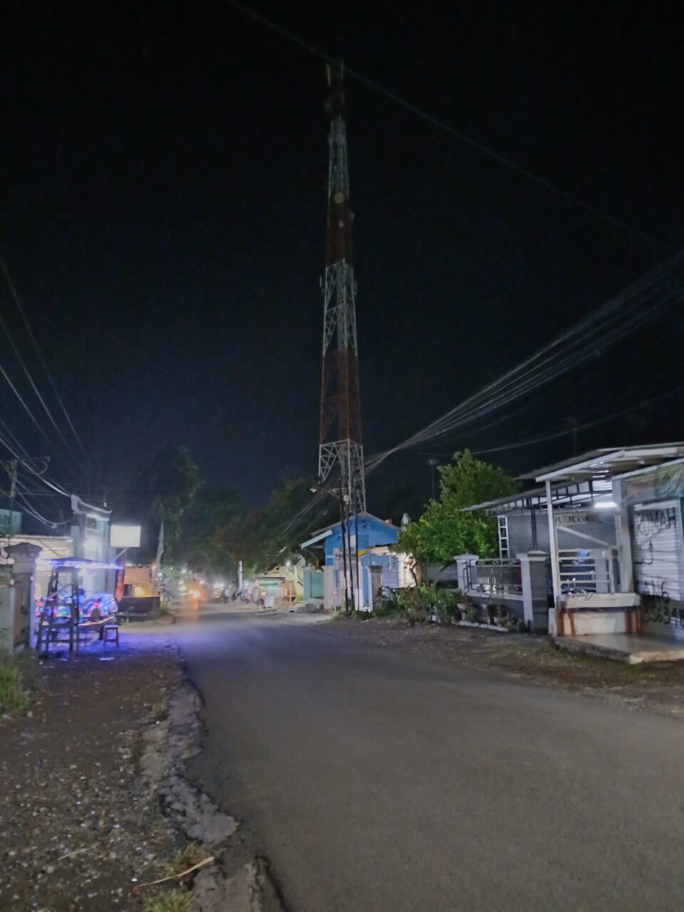Gambar ini menggambarkan suasana jalan kecil di malam hari, ditemani cahaya lampu yang redup dan menara sinyal menjulang tinggi di kejauhan. Sekilas tampak biasa, namun jika diperhatikan lebih dalam, foto ini menyimpan makna tentang kesunyian yang menyelimuti kehidupan modern.Menara itu menjadi simbol komunikasi, tetapi di sekelilingnya, jalan tampak sepi tanpa manusia. Ironis, di era di mana semua orang terhubung secara digital, lingkungan sekitar justru terasa hampa. Koneksi antarhati tak lagi sekuat sinyal di udara. Setiap rumah tertutup rapat, dan interaksi nyata tergantikan oleh cahaya layar.Foto ini seakan mengingatkan kita: kemajuan teknologi memang mendekatkan yang jauh, tetapi jangan sampai menjauhkan yang dekat. Di balik menara tinggi itu, ada harapan agar manusia kembali menatap, berbicara, dan berbagi hangat secara nyata, bukan hanya lewat pesan singkat di malam yang sunyi.
