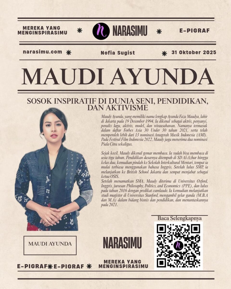 Maudy Ayunda bukan hanya dikenal karena kecerdasannya, tetapi juga dedikasinya terhadap pendidikan, literasi, dan pemberdayaan pemuda. Melalui platform pribadinya dan gerakan sosial seperti Inspira dan Leaders Camp, ia berupaya menumbuhkan semangat belajar serta memberikan dampak positif bagi generasi muda.