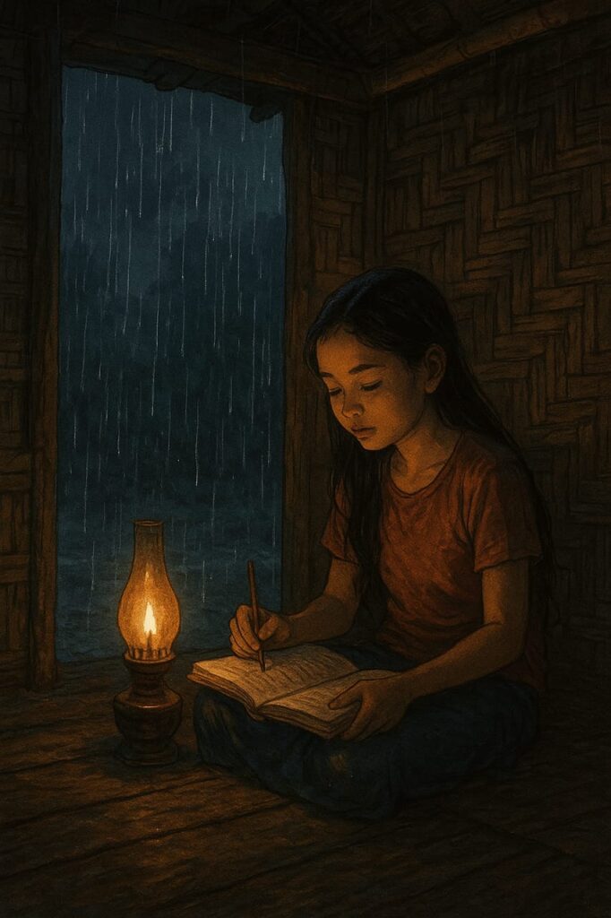 Hujan sore itu turun deras di desa Karangsari. Jalanan becek, atap seng meneteskan air tanpa henti. Namun di sebuah rumah bambu kecil di tepi sawah, cahaya lampu minyak masih menyala. Di sana, seorang gadis bernama Laras (16 tahun) sedang menulis di buku lusuh sambil menahan kantuk.