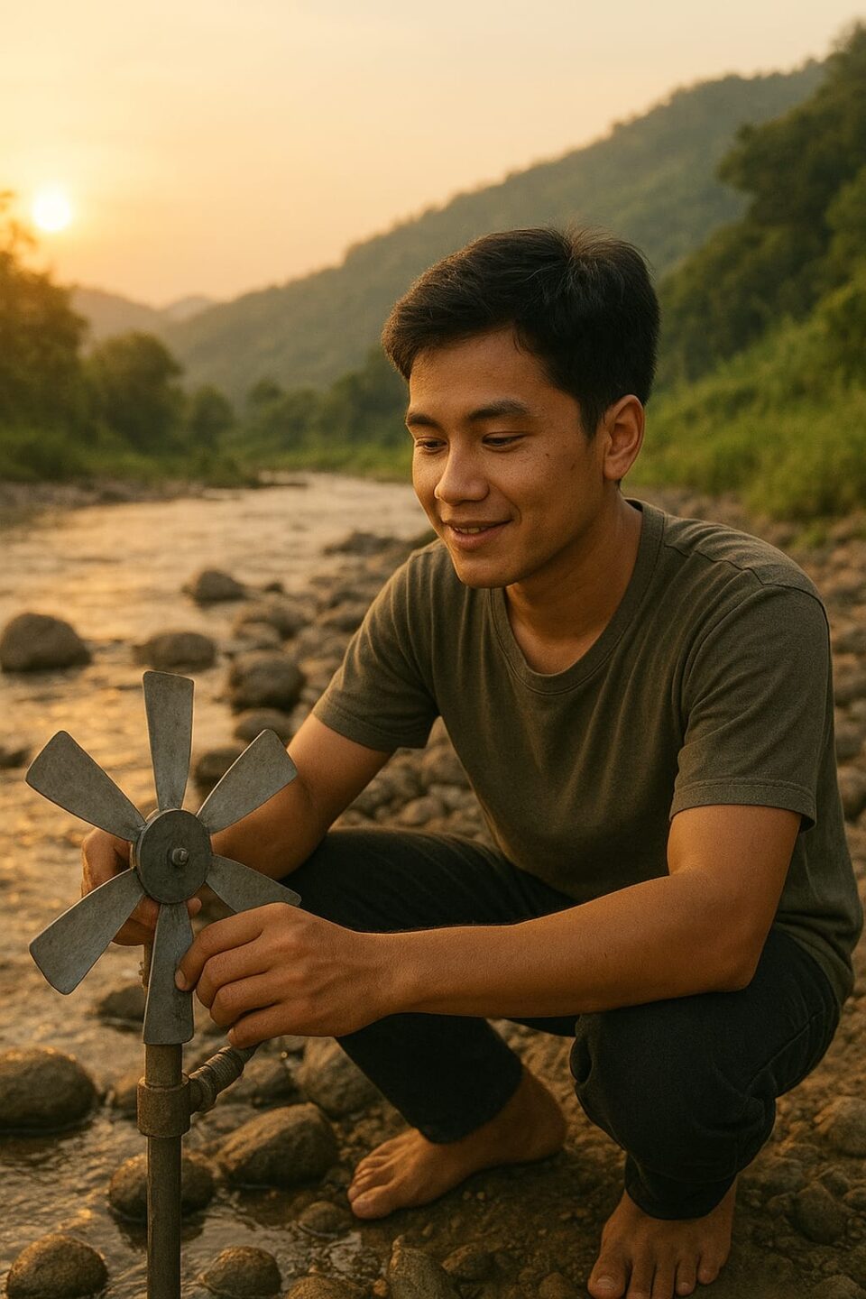 Setiap sore, ketika matahari mulai condong ke barat, Rizky terlihat sibuk di tepi sungai. Dengan pakaian sederhana dan tangan yang tak lepas dari perkakas, ia merakit turbin kecil dari potongan besi bekas dan kipas motor. “Awalnya cuma coba-coba,” katanya sambil tersenyum. “Tapi ternyata air bisa benar-benar jadi cahaya.”
