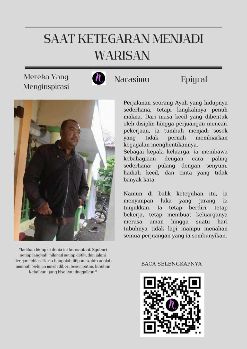 Namun di balik keteguhan itu, ia menyimpan luka yang jarang ia tunjukkan. Ia tetap berdiri, tetap bekerja, tetap membuat keluarganya merasa aman hingga suatu hari tubuhnya tidak lagi mampu menahan semua perjuangan yang ia sembunyikan.