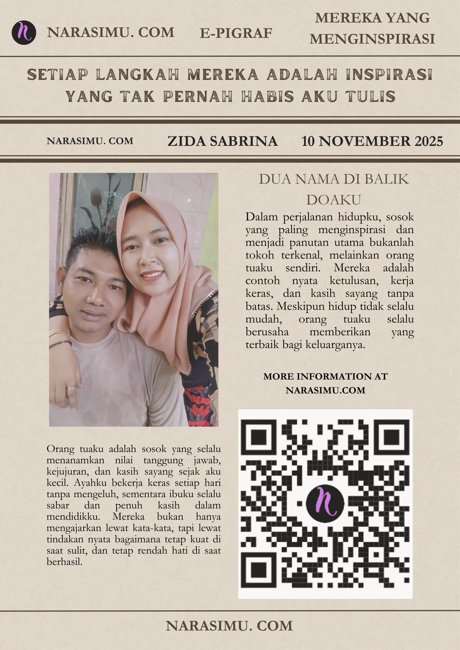 Orang tuaku adalah sosok yang selalu menanamkan nilai tanggung jawab, kejujuran, dan kasih sayang sejak aku kecil. Ayahku bekerja keras setiap hari tanpa mengeluh, sementara ibuku selalu sabar dan penuh kasih dalam mendidikku. Mereka bukan hanya mengajarkan lewat kata-kata, tapi lewat tindakan nyata bagaimana tetap kuat di saat sulit, dan tetap rendah hati di saat berhasil.