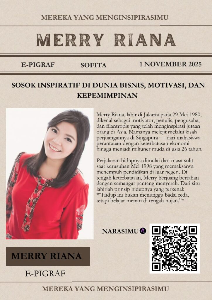 Di tengah derasnya arus persaingan ekonomi dan perubahan sosial, nama Merry Riana bersinar sebagai simbol ketekunan, keberanian, dan keyakinan akan kekuatan mimpi. Ia bukan hanya motivator ternama Asia, tetapi juga sosok inspiratif yang membuktikan bahwa kesulitan bukanlah akhir dari perjalanan, melainkan awal dari kebangkitan.