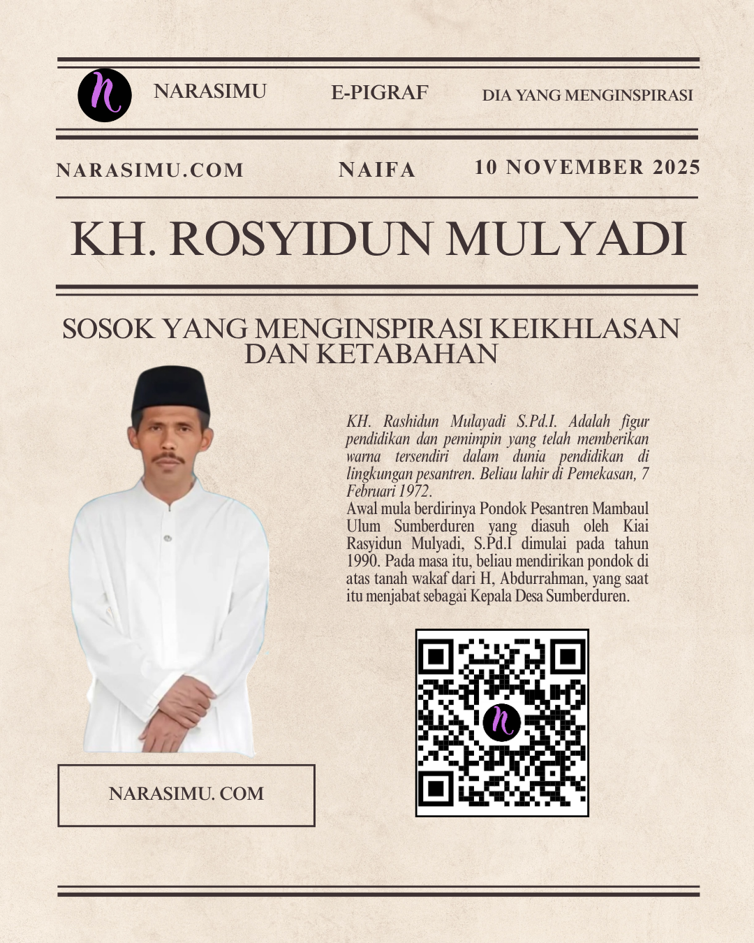 Setiap kali aku mengenang sosok KH, Rosyidun Mulyadi, hatiku selalu diliputi rasa haru dan kagum yang mendalam. Beliau bukan hanya seorang pendidik, tetapi juga seorang teladan sejati yang menunjukkan arti keikhlasan dan keteguhan dalam mengabdi kepada Allah melalui dunia pendidikan.