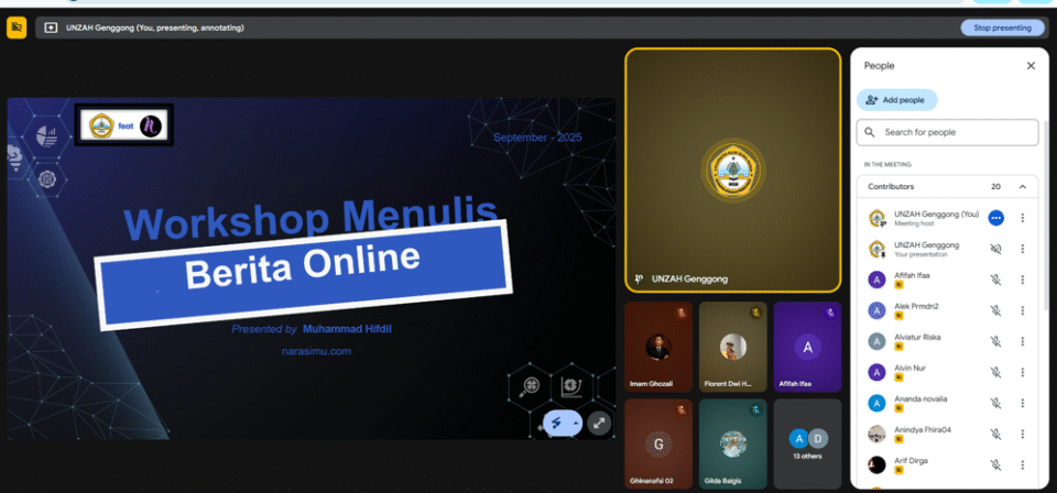 Probolinggo, 4 September 2025 — Universitas Islam Zainul Hasan (UNZAH) Genggong kembali menunjukkan komitmennya dalam mengembangkan potensi mahasiswa melalui Virtual Workshop bidang Jurnalistik yang digelar pada Kamis (4/9). Kegiatan ini diikuti oleh mahasiswa dari berbagai program studi UNZAH dengan penuh antusiasme.